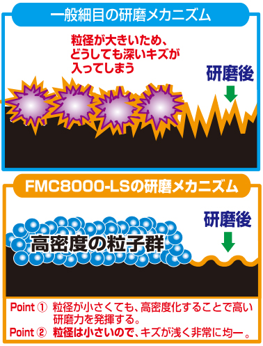 微粒子研磨材を均一な粒子径で高密度に配合することにより、研磨力を上げ、バフ目を軽減させます。